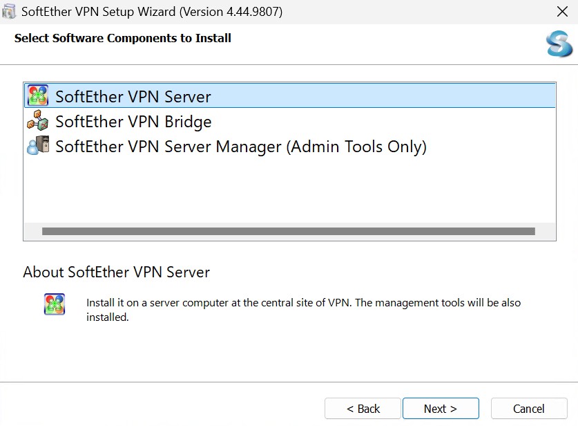 Start the installer by double-clicking the VPN Server installer file. On the screen for selecting the software to install, select "VPN Server". The Windows Installer-based installer starts automatically. Using the installation wizard, you can select the name of the installation directory. (By default, the program is installed to Program Files\SoftEther VPN Server on the system drive.) The VPN Server process writes large log files to the installation directory, so we recommend selecting an area on the hard drive that has high transfer rate and a large amount of unused space.